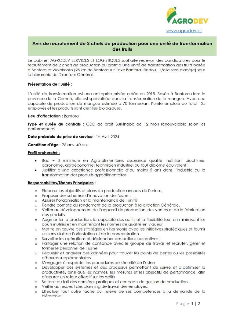Avis de recrutement de 2 chefs d'usine au p...